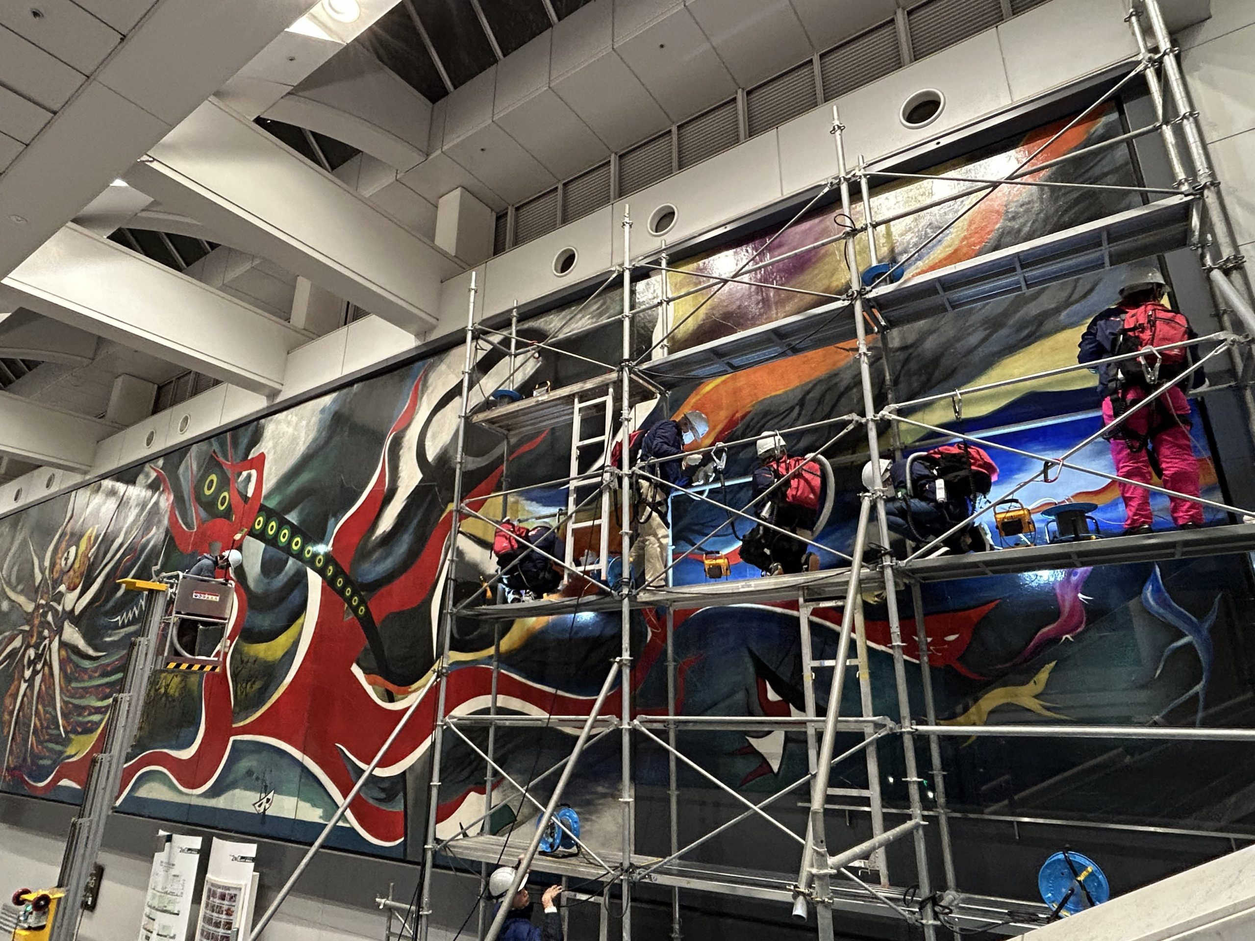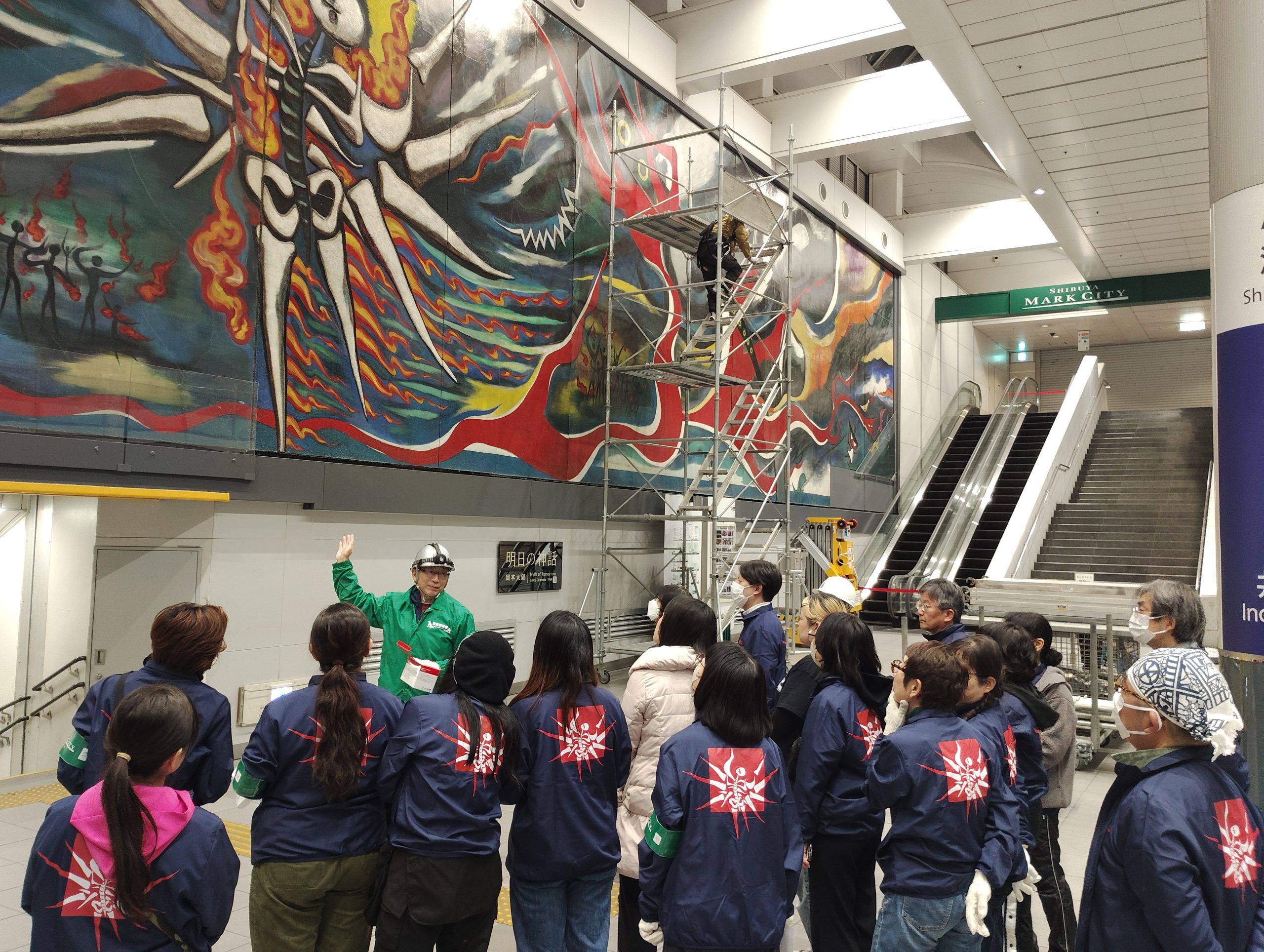 当NPO法人では『明日の神話』公開記念日である11月17日を前に、毎年この時期の終電後の4日間、『明日の神話』の表面に付着したホコリを取り除く「すす払い」を行っています。
